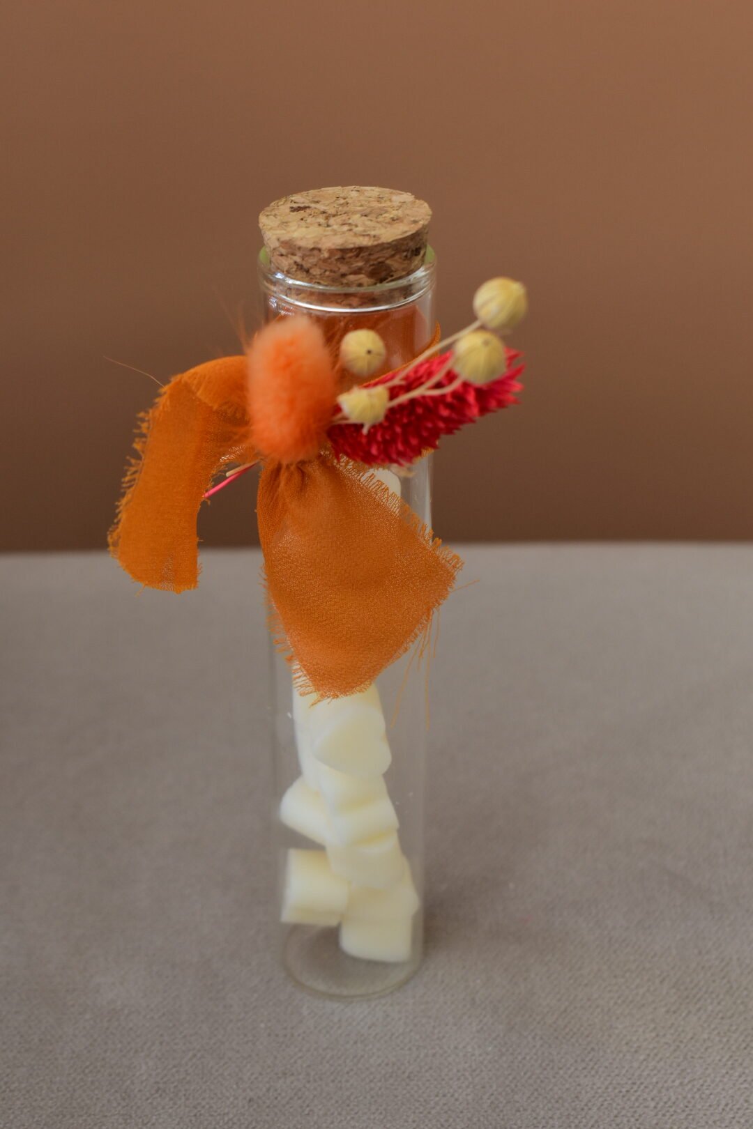 Γυάλινος σωλήνας με φελλό που περιλαμβάνει αρωματικά wax melt σε σχήμα καρδούλας. ύψος 16εκ.